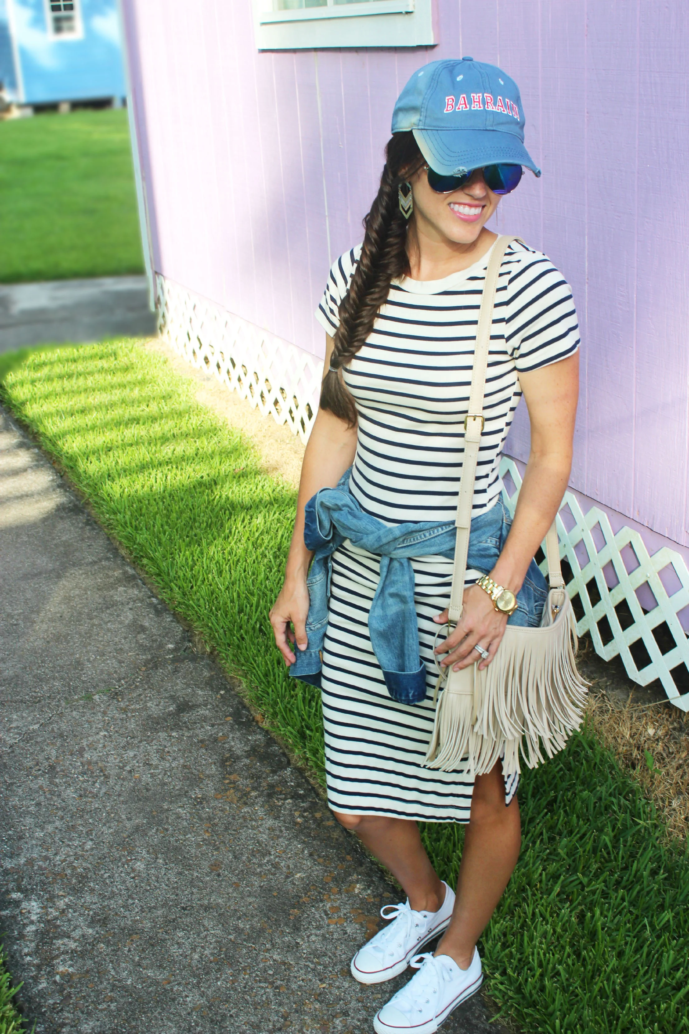 dress: TJ Maxx (similar here), Converse: Nordstrom, watch: Target, bag: Charming Charlie (similar here), jacket: GAP, earrings: Forever 21, sunnies: Forever 21, cap: old (love this one)