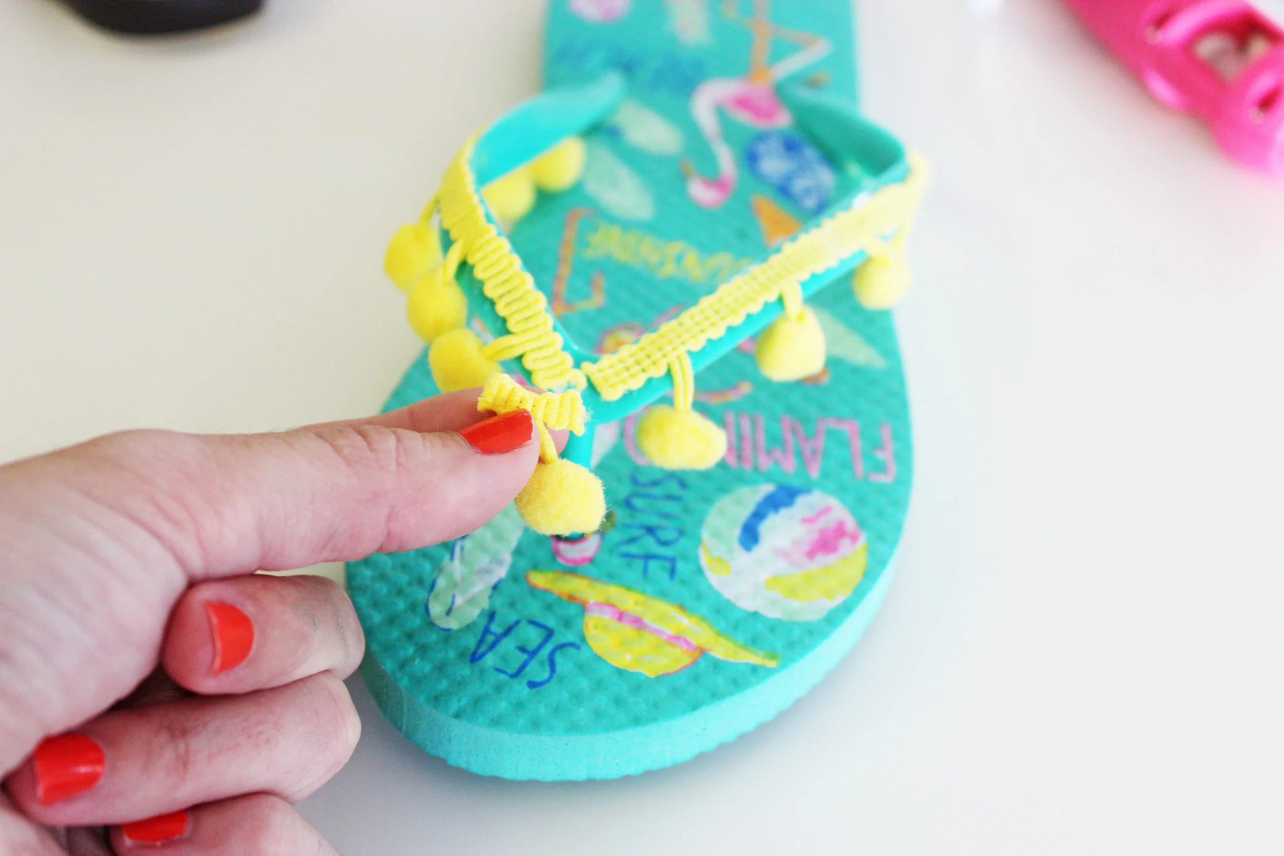 Step One: Taking the pom pom ribbon, measure the length from the center of flip flop strap to the end. Cut the ribbon that length.