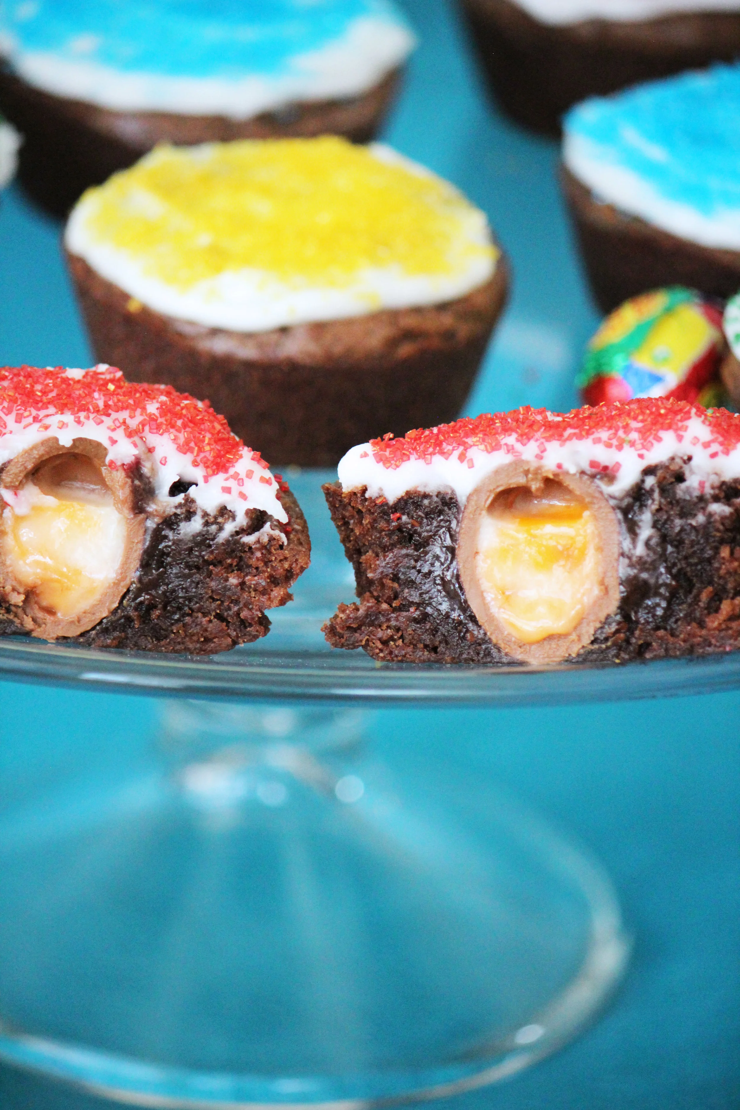 These brownies are incredibly fudgy and rich, combined with an ooey-gooey Cadbury Egg center. And because that's just not sweet enough, I added vanilla frosting and sprinkles to take these bad boys over the top. The frosting also serves to cover the hole where the egg was pushed in, but who really cares about presentation when something tastes this good. You won't be able to stop at just one (or four), promise.