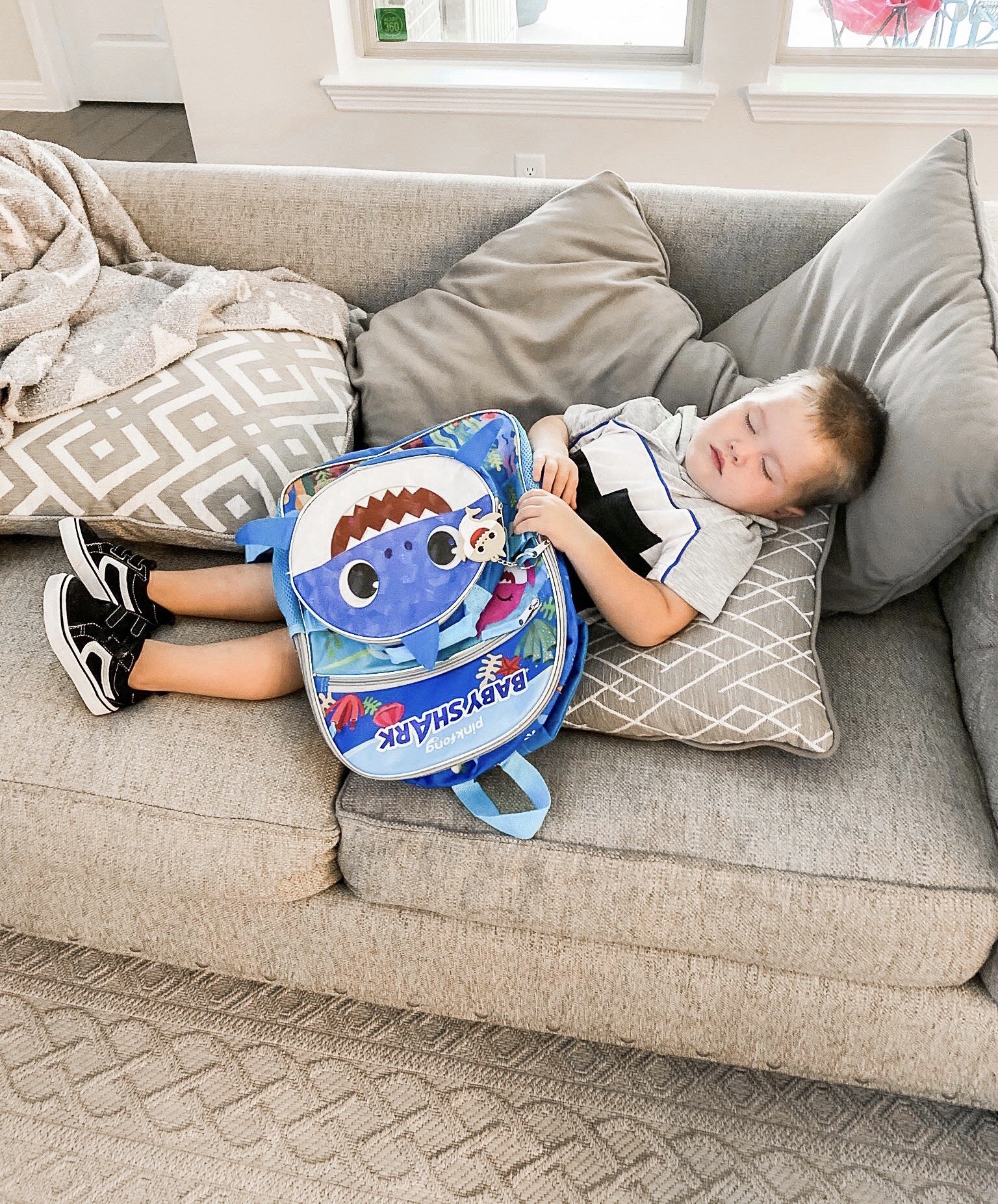 Boone is obsessed with his Baby Shark backpack- so much so that he fell asleep with it the other day. The 5 piece set is $16 and I love that the lunchbox snaps onto the front of the backpack. I can’t get over his new black sneakers that look like a designer pair for a fraction of the price. We truthfully aren’t sure if Boone will be heading back to Mother’s Day Out this fall or not, but he loves feeling like a big boy and doing everything big brother does. When Boone does start back, he’ll be all set!